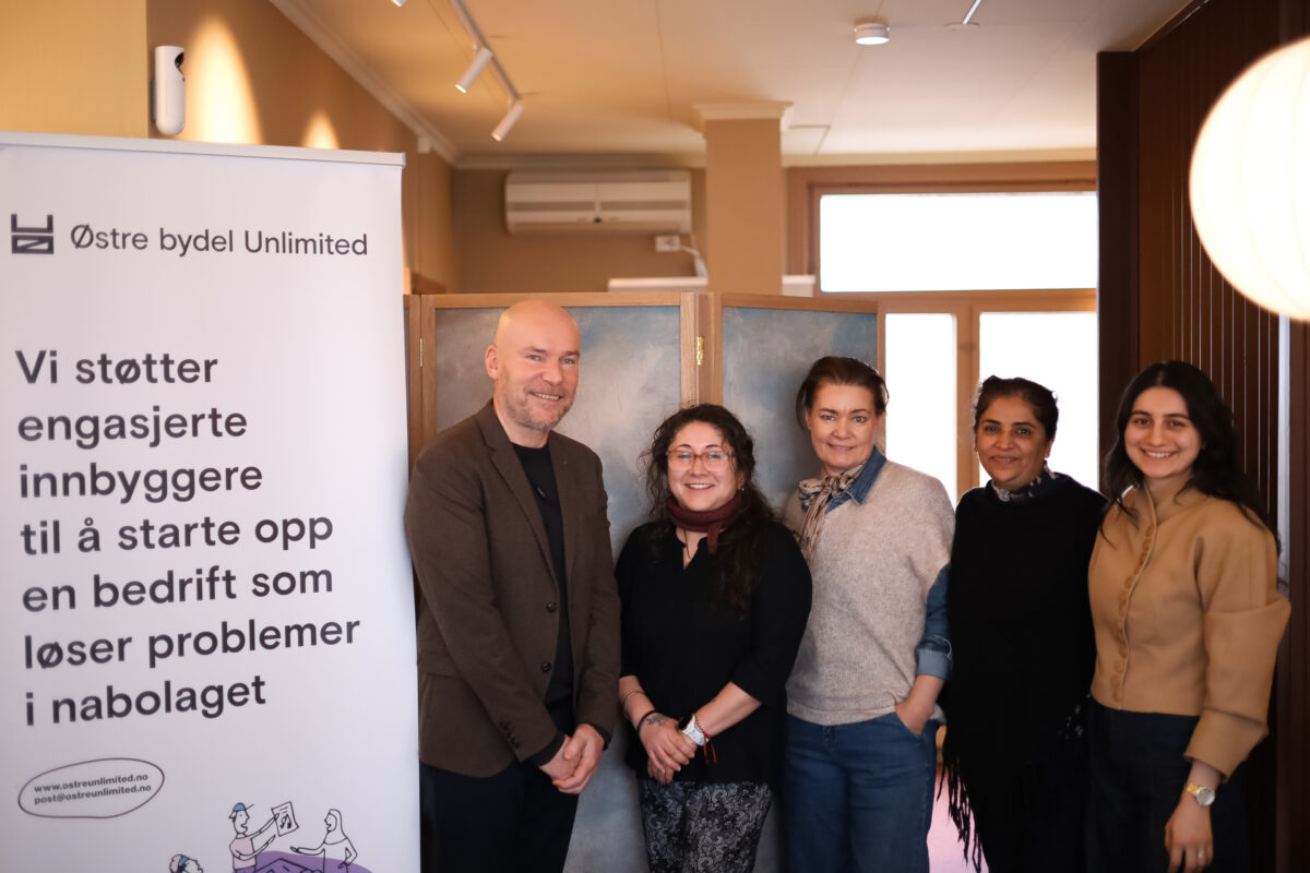 Fra venstre: Lars Fredriksen, Yilma Taibo, Cathrine Hovland, Safina Majothi og Dilan Nenningsland samlet i nabolagsinkubatoren Østre bydel Unlimited i St. Marie gate 55.